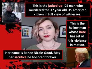 ICE murders American citizen; trump spins it; protests; Maduro pleads not guilty; Zionism & Venezuela; Honduran hypocrisy; trump threatens everyone; Mark Kelly vs. Hegseth; Tim Walz; CDC; new inverted food pyramid; Postal Service; Kennedy Center; losing GOP; Jimmy Kimmel; trump to run Venezuela? what a joke; Colombia; FEMA; Greenland; child care cuts; Mamdani; Jan 6 revisionist history; midterms; where’s Tulsi?; Hilton; 1% Epstein files released; trump pulls out of 66 treaties; headline news.